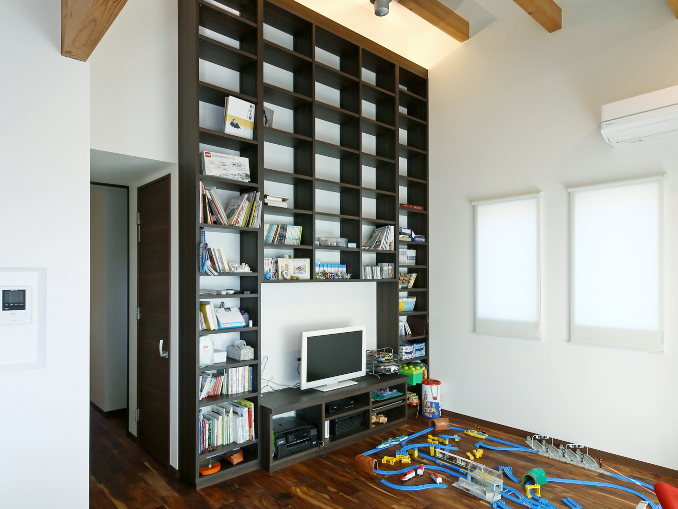 天井いっぱいまで伸びる大容量の本棚を造作したリビング。