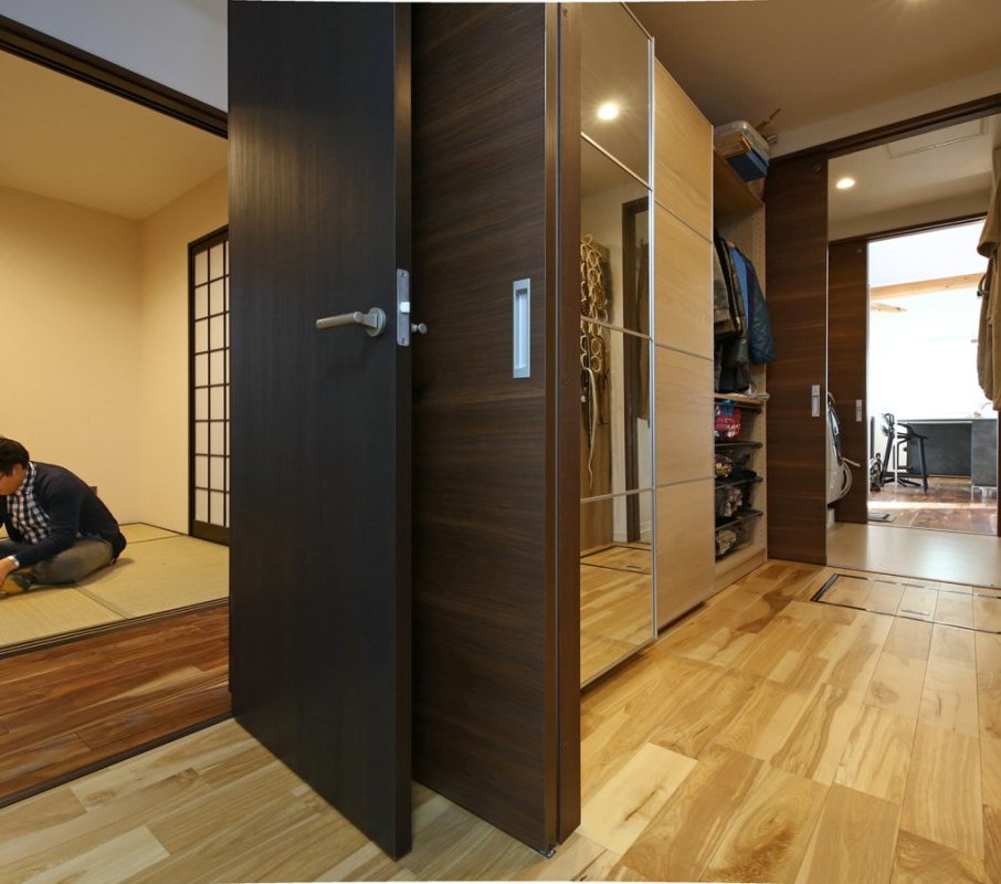 また主寝室~キッチンまでの引き戸を開けると隠れていた一直線の家事動線が現れるようになっています。