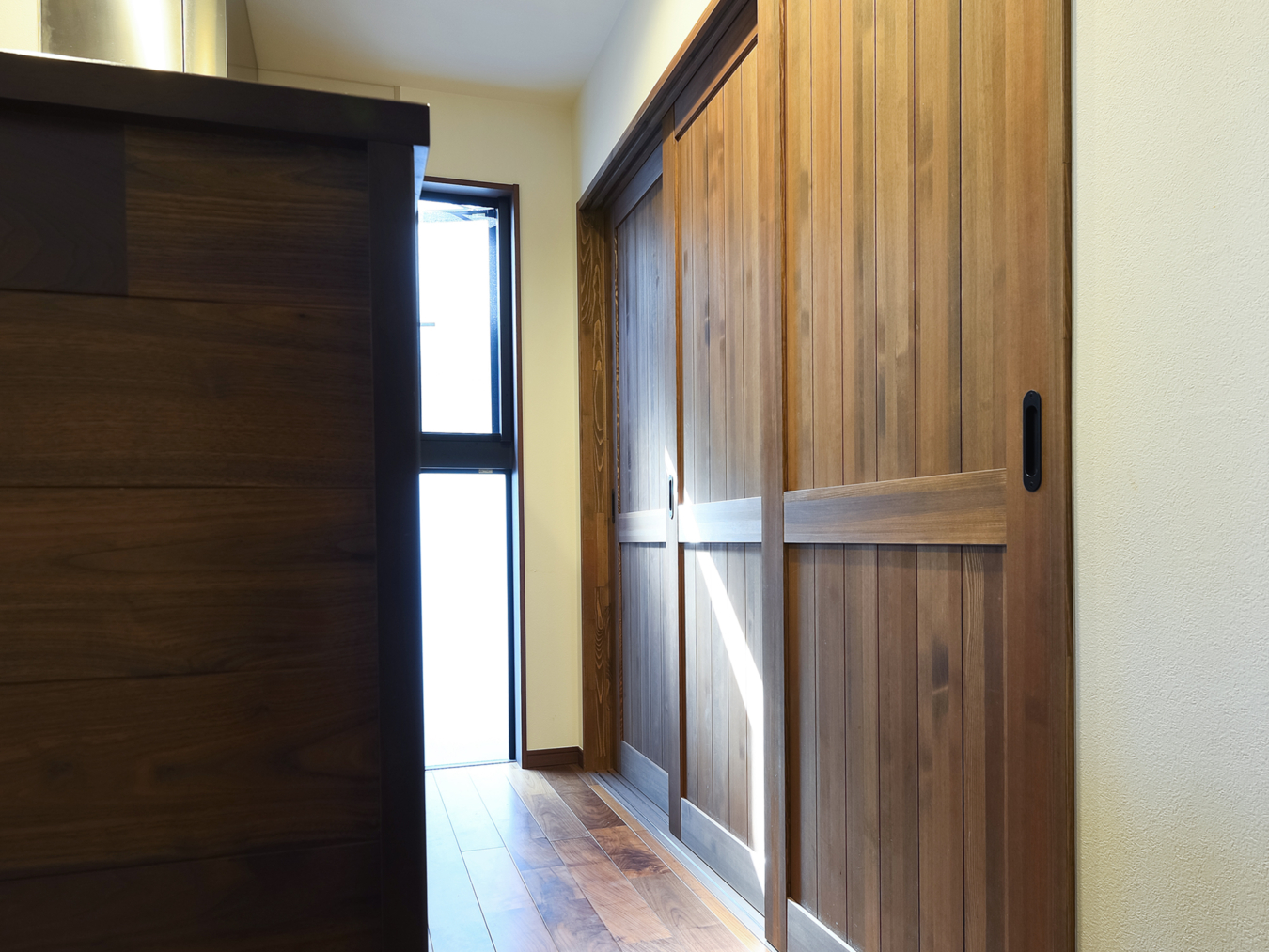 キッチンの背後にある引き戸収納。台所用品や食器、電子レンジなどを全てスッキリと収納できます。