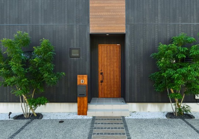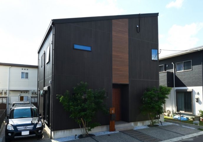 勾配屋根を採用した外観に茶色の縦ラインが表情を加えるスタイリッシュなデザイン。