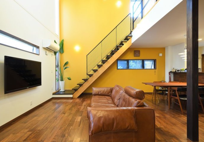 黄色の壁紙に映える黒のスケルトン階段は、展示場で見学して気に入り、取り入れたものの一つです。