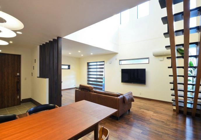 開放的な吹き抜けやスケルトンの階段、玄関からリビングをひと続きにしたオープンな空間設計は、