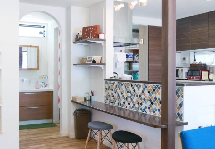 天井の化粧梁がアクセントになったLDK。キッチンのカラフルなタイルが特徴的です。