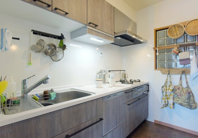 グレーの木目調がかわいらしい品のあるキッチンに。