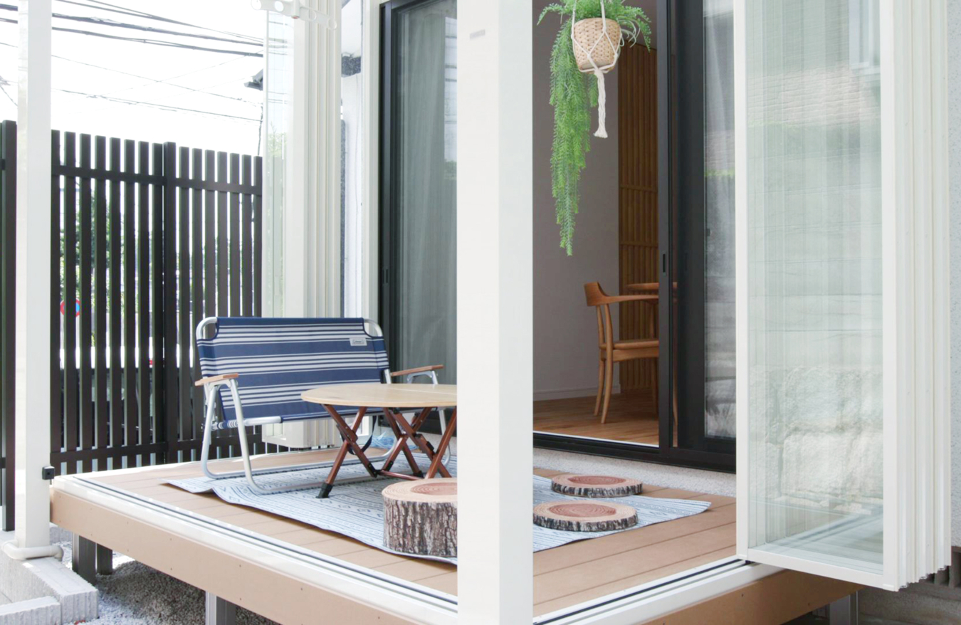 ダイニングの側にあこがれのテラスを設置。道路からの目線を木のルーバーで遮断しています。