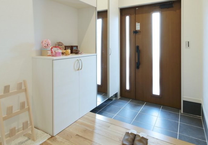 白い壁を基調に、明るいイメージに。 シューズボックスを大きくし、収納をたっぷり確保しました。