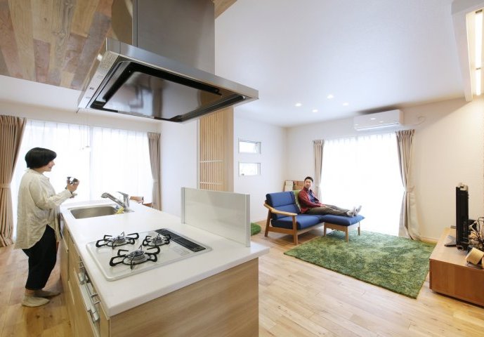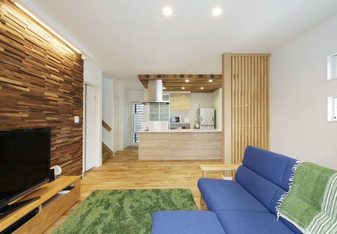 テレビボードがある壁面は立派なアクセントウォールを付け、キッチン側の目隠しにはルーバーを設置。どちらも木を使ったナチュラルかつスタイリッシュな内装となってます。