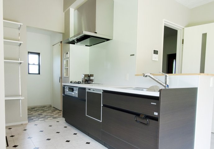 生活の動線を考え、向きを変更したキッチン。 収納にも気を遣いました。