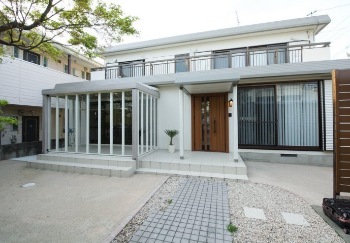 構造体を残しつつ、壁やドアを一新した外観。 テラス囲いを取り付けたことで、印象がガラリと変わりました。(左:リフォーム後 右:リフォーム前)