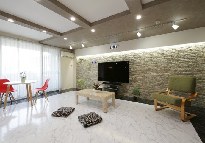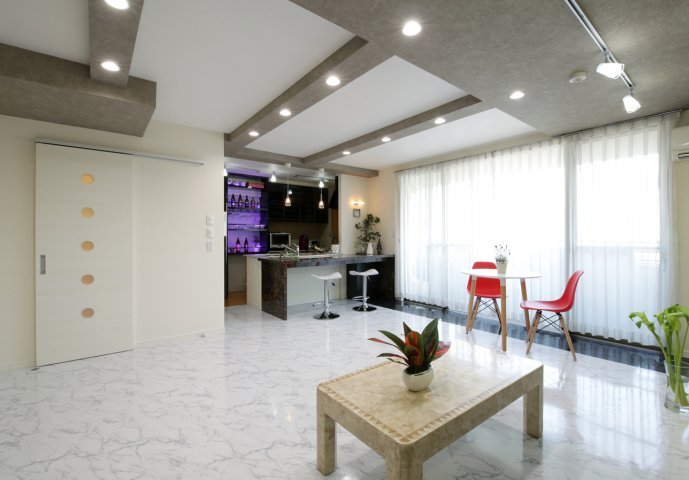 和室を無くして、広くなったリビングダイニング。 大理石調の床と石張り風の壁でスタイリッシュな内装になりました。