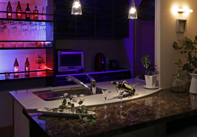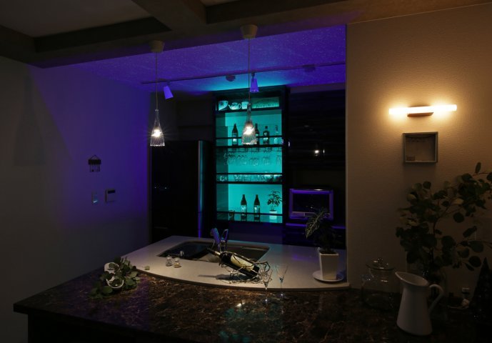 バー風に作り変えたキッチン。 造作のボトルラックは、雰囲気のあるライトで色が変わり、まるで本物のバーにいるよう。