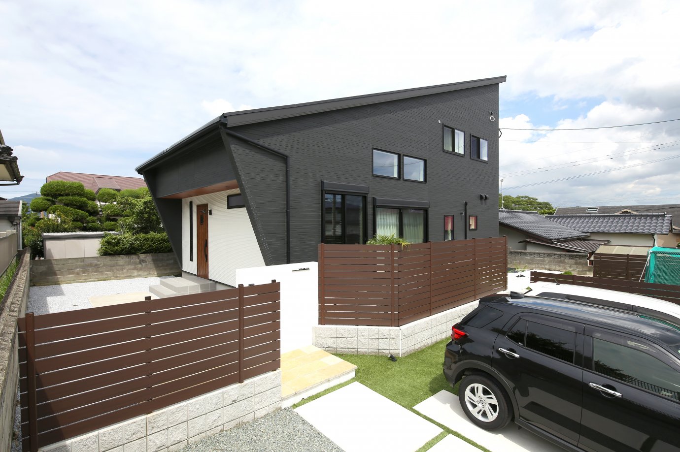 郊外の住宅地でもあり、少し都会的なイメージを出したかったご主人が選んだのは、黒系の外壁。それだけに玄関周りのホワイトが差し色となってメリハリを感じさせます。大屋根の描く直線が力強さとアーバンな美しさを主張しています。