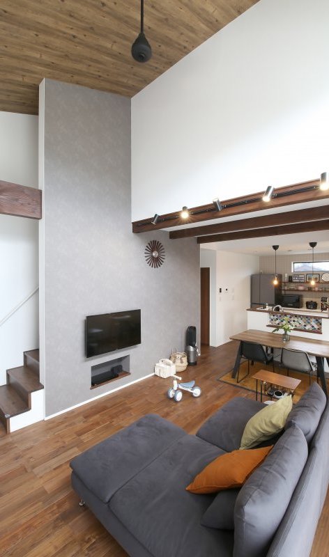 外観からも想像できますが、大屋根の勾配を活かした吹き抜けの大空間は一見の価値ありです。リビング自体も吹き抜けがあることで、より一層広く感じることができます。天井の化粧梁がアクセントになり、木のぬくもりあふれる心地よい空間になっています。「自然素材の無垢の床に寝っ転がって、天井を見るのが好き」と言われる奥様の気持ちがよく分かります。