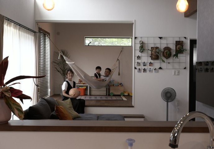 「リビングとの空間の区切りを作りたくてスキップフロアにしました。ちょっと腰かけたり、お客様のゲストルームにもなったりととてもお気に入りです」と奥様。特に目に入ってくるのがハンモック。「ここでスマホの動画を観たり、子どもと遊んだり、吹き抜けや外の景色を見ながらたそがれています」と嬉しそうなご主人。まさにアジアンリゾートの雰囲気が感じられるスペースです。