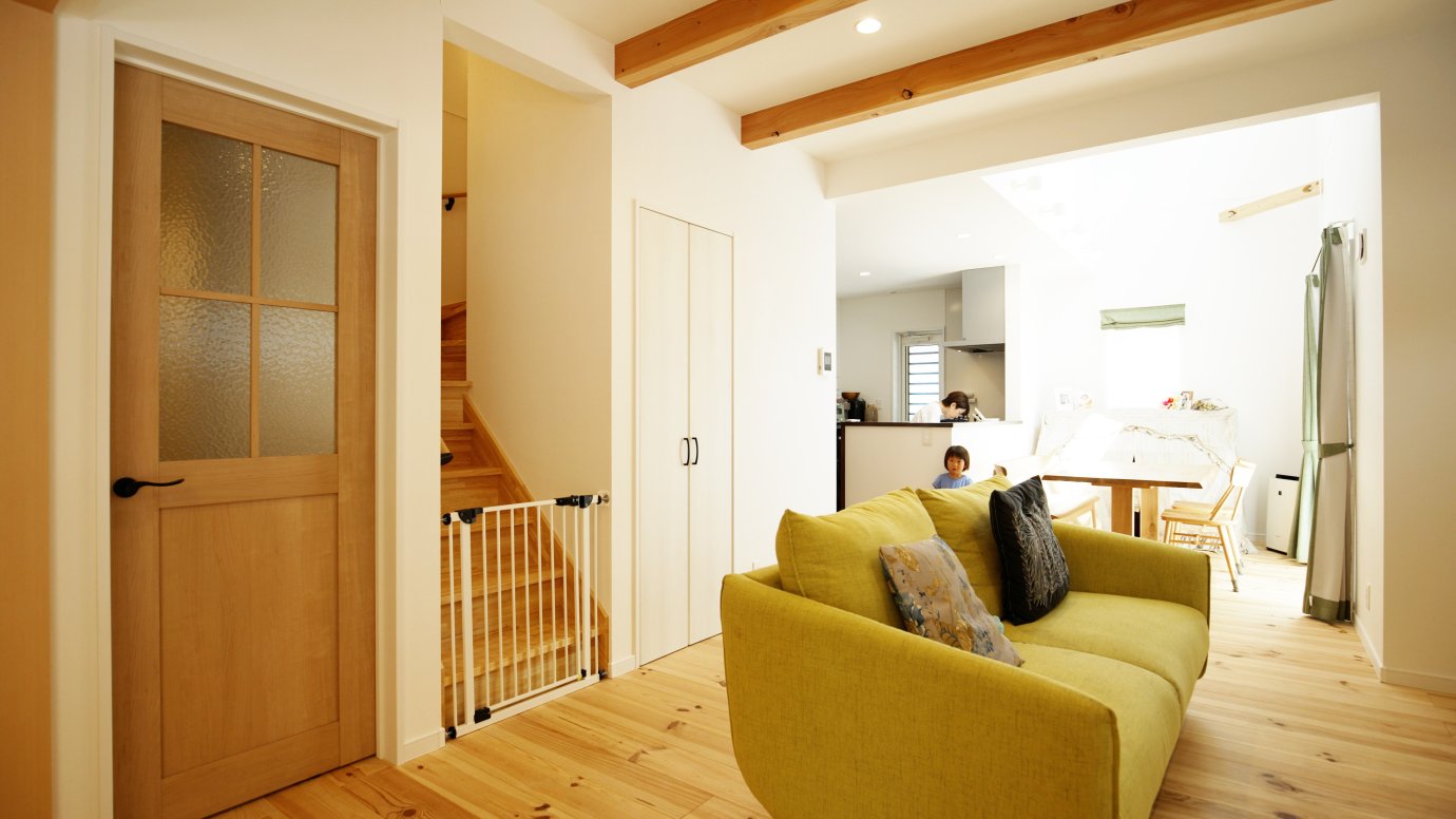 子どもが裸足でかけ回る無垢材の床が心地よい家