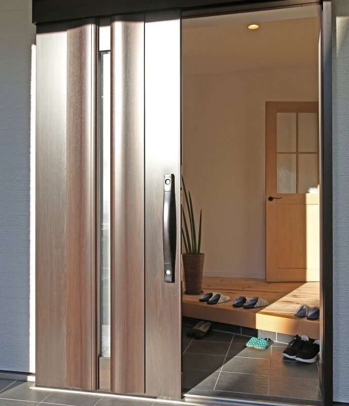 アプローチから続く玄関の床はシックな天然石で広々とした一体感を感じます。引き戸の玄関ドアはとってもスマート。上り口は2WAYで、コートなどを掛けられるスペースもあり機能的です。そして、ミニ水栓は今ではマストアイテムとなっていて来客にもうれしい設備ですね