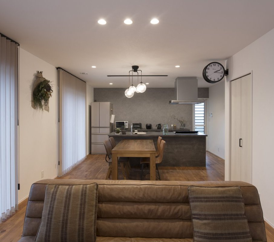 LDKのフローリングは、ボルドーパイン。木目や節がはっきりと現れるのが特徴的。幅広で上質な雰囲気がLDK全体をさらにグレードアップしています。「オプションでしたけど、ここは譲れませんでした」と大満足。