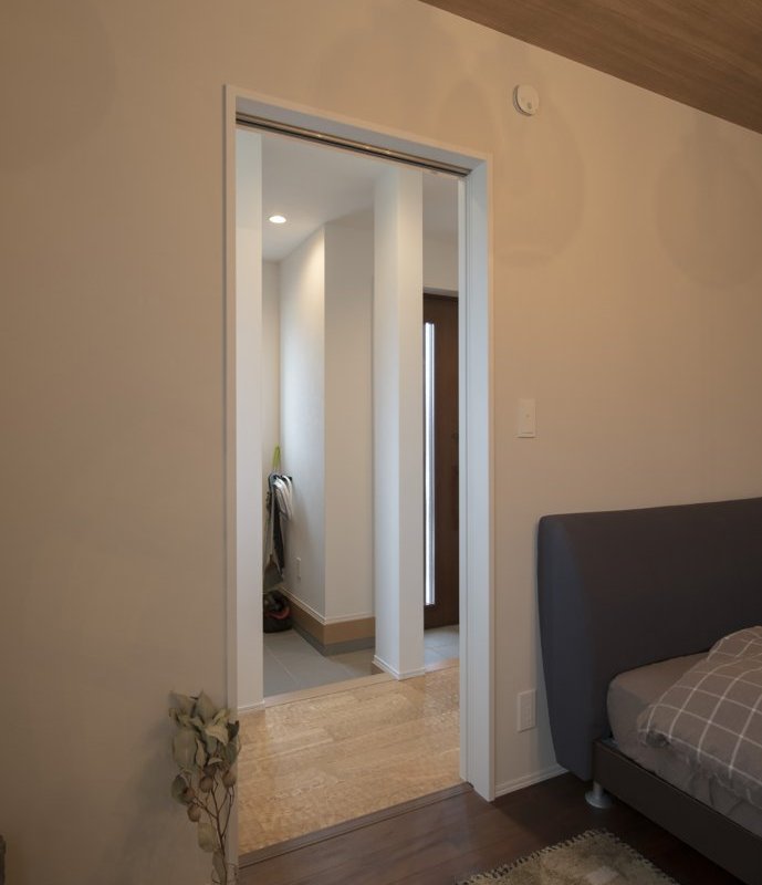 そして、玄関から上がってすぐの寝室。通常、ベッドルームは家の一番奥まった場所にあることが多いのですが、夜遅くにお仕事から帰ってきたときも、家族を起こさないようにと、玄関からすぐに寝室へ行けるような動線に。シフト制のお仕事をされるご主人に合わせた、D様邸ならではの間取りです。