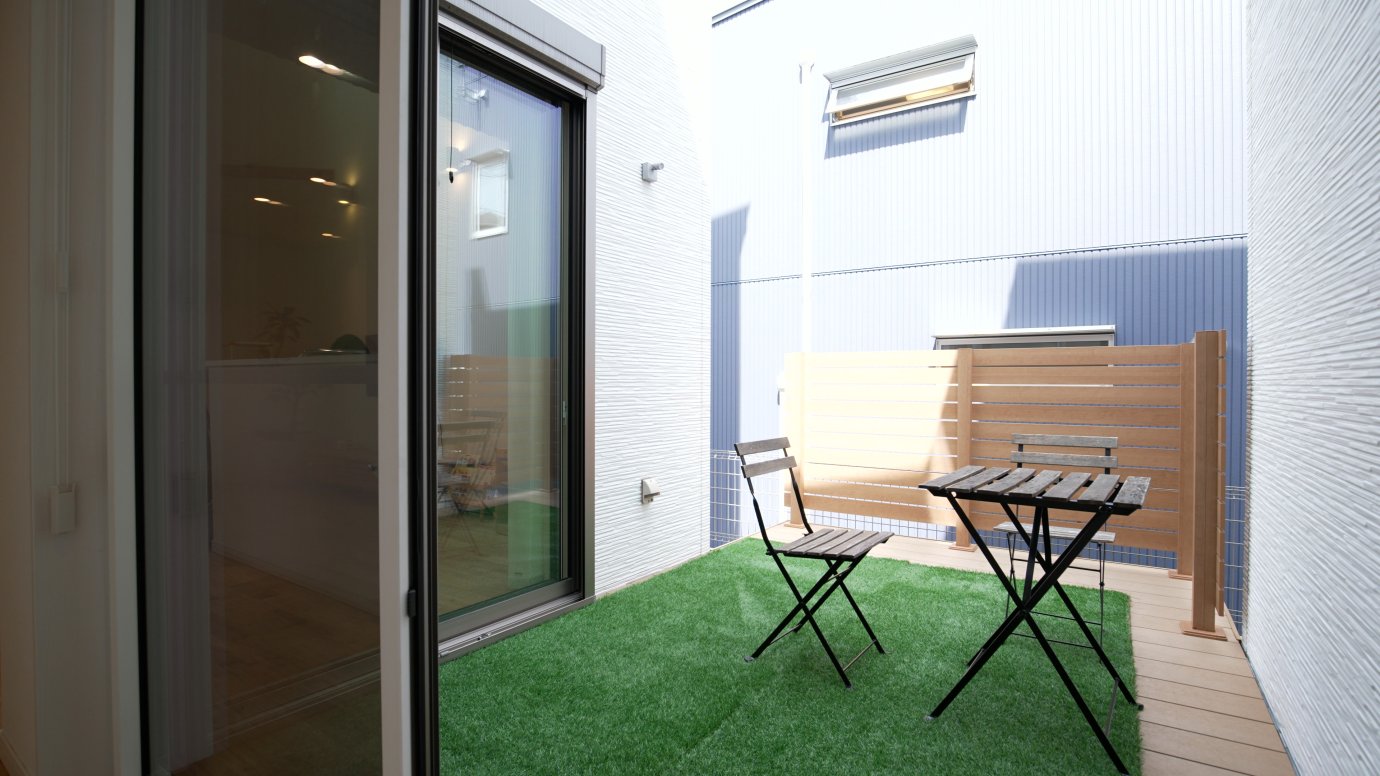 そして完成した家は、ご主人のこだわりが詰まったコの字型のおうち。両隣に家がある土地なので、「中庭を作ることで家の中を明るく、そして風通しを良くしたかったんです」とのこと。この“コの字型”には、奥様にも大きなメリットがありました。「実は私の仕事はリモートが中心で、家の中だけでなく、この中庭で仕事をすると気分もいいし、Wi-Fiのエリア内なので業務もはかどります」と満面の笑顔。土地探しから住み心地、さらにお仕事にまで配慮したこだわりのおうちに大満足のおふたりでした。
