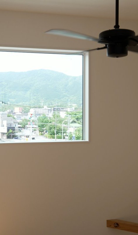 吹き抜け上部にある窓からは、光はもちろんのこと、福岡市のシンボルでもある油山の緑が目にも鮮やかに飛び込んできます。「たまに2階の格子のところからこの景色を眺めると、ふと実家を思い出すこともありますね」と心の癒しにもなっているそうです。2階ホールにある横に大きなFIX窓は外から見れば中庭の上部にあります。家の中では比較的暗くなりがちな空間にも光を届けてくれています。