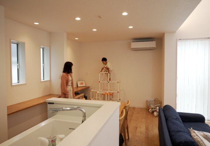 「ここからだと子どもに目が届くので安心ですね」と微笑む奥様は、キッチン横にあるスペースもお気に入り。壁にはカウンターが設けられ、小物を飾ったり、ここでもリモートワークをしたりとユーティリティーな環境を使いこなしています。