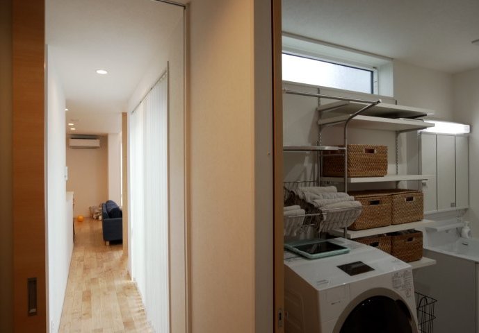 玄関を上がるとすぐ目の前にサニタリーとバスルーム。暮らしのスタンダードになった手洗いやうがいがストレスなく出来ます。また、ホールの足元にある窓からは光が入り、無垢材の床をやさしく明るく照らしています。