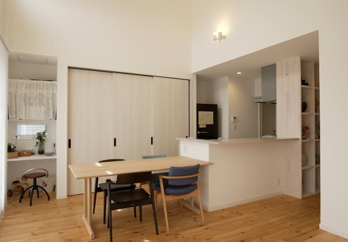 毎日料理をするキッチンも考えられています。引き戸の大容量のパントリーのおかげで見た目がすっきりとしたダイニングルームは奥様のお気に入り。お嬢さんのアート作品を飾る大きめのラックとドレッサーも兼ねているミニカウンターが壁のないひとつの空間にアクセントを持たせています。