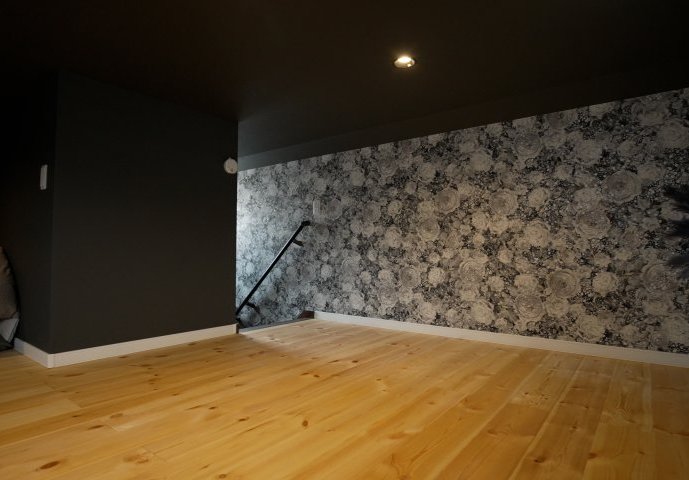 基本的にお嬢さんのお部屋になっているロフト。「ここに寝るのが一番気持ちいいんです!」とは奥様の感想。ロフトの奥には壁をくり抜いたようなスペースがあり、隠れ家感を演出しています。さらに秀逸なのは、ロフトまでの階段の壁に貼られた大胆な花柄の壁紙。とても芸術的で、個性的。なかなか選ばれないデザインのようで、それはクロス職人さんの言葉に表れています。「私も長年クロスを貼って来ましたが、このデザインは初めてでした」と。