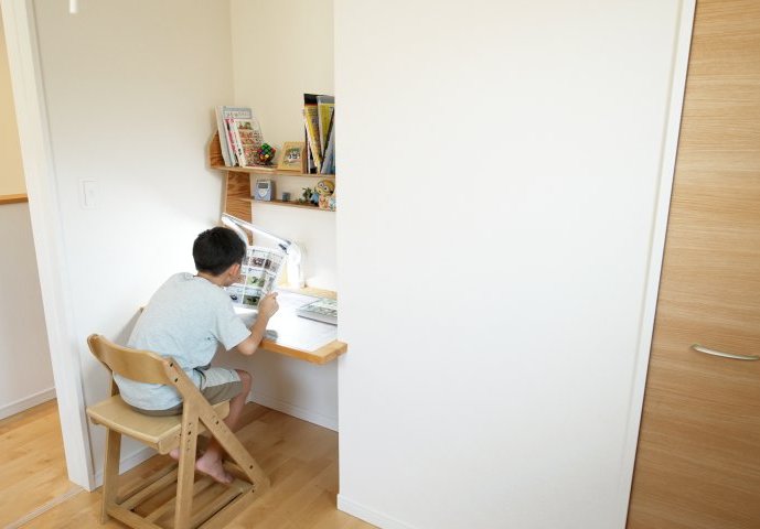 子どもたちのそれぞれの部屋にある学習机。市販の学習机は様々な機能が付いているので、かなりのスペースを取ってしまいますが、造り付けにすることで、ちょうどよいサイズとなり、空間をうまく利用できそうですね