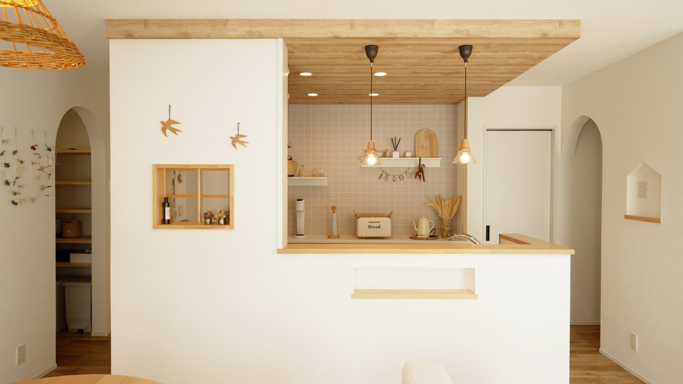 室内に入るとまず目に飛び込んでくるのはアイランドキッチン。このキッチンもカップボードやペンダントライト、下がり天井、そしてダイニングテーブルに目を配ることのできる小窓が付いていて、ここだけでおしゃれなCaféのよう。もちろん機能性も確保され、「動きやすいのとお料理しながらテレビを観れるのでとっても気に入ってます!」と奥様の満足度も◎です。
