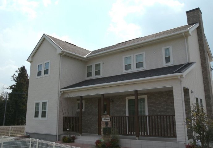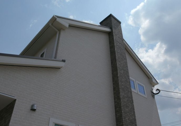アメリカンカントリースタイルの外観に、ラップサイディング(鎧張り)のカントリースタイルそのままではない、レンガ調のサイディングを選択してこだわりの煙突と