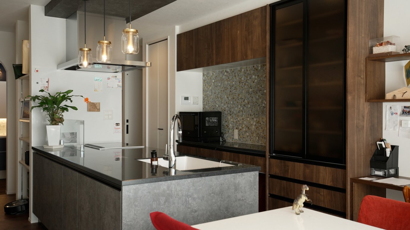 モダンなキッチンが室内を上質な空間に。アイランド型を選んだのはもちろん動きやすさを優先したからです。ワークトップも広く、お料理も片付けもスムーズです。カップボード側の壁はクロスでもタイルでもなく、高級さを演出する石貼りを採用。陽が落ちるととってもムーディな空間に変わるそうです。