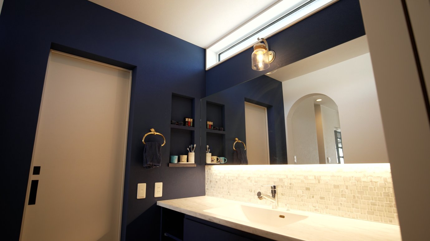 「このサニタリーにはこだわりました!」とテンションが上がる奥様。とにかく広くしたかったそうです。テーマは今、トレンドにもなっている“ホテルライク”。大きな1枚鏡が使いやすさを主張しています。キッチンやリビングからアールの壁の向こうにいつも見ることが出来るサニタリーがとってもお気に入りです。