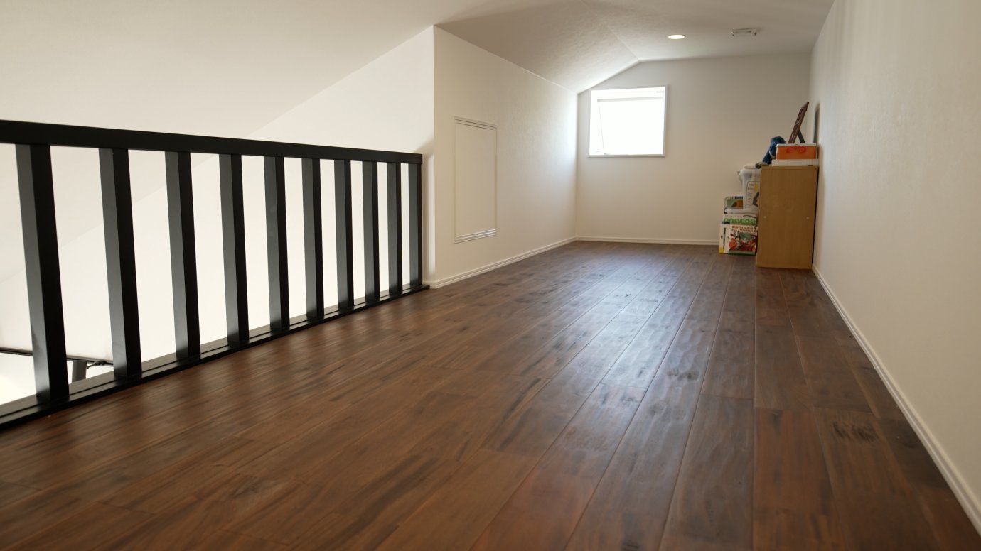 ここはご主人のこだわりスペースです。ピアノ室とキッチンの間に梯子があり、そこを上ってロフトへ。ここがとても広くて、部屋としても十分な機能を果たしています。玄関ホールまで続いていて窓もついており、明るさも確保出来ています。