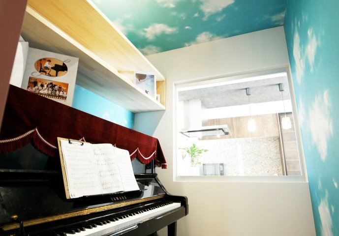 驚きなのはこのスペースが家のほぼセンターに配置されていること。色はピンクでゴールドのドアノブ。まさにあの人気アニメの“どこでもドア”を再現しています。クロスは青い空に白い雲が浮かんでいるデザイン。奥様曰く「このドアを開けると空を飛んで世界中のどこにでも行けるというイメージです」とのこと。さらにキッチン側には大きな窓を設け、ちゃんとピアノルームの中を確認できる、安心設計となっています。
