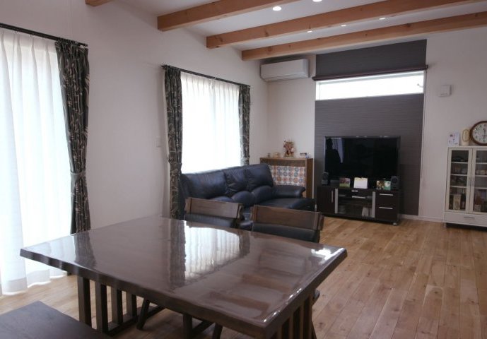 上部に吹抜けのあるLDK。天井には存在感を主張する見せ梁が。