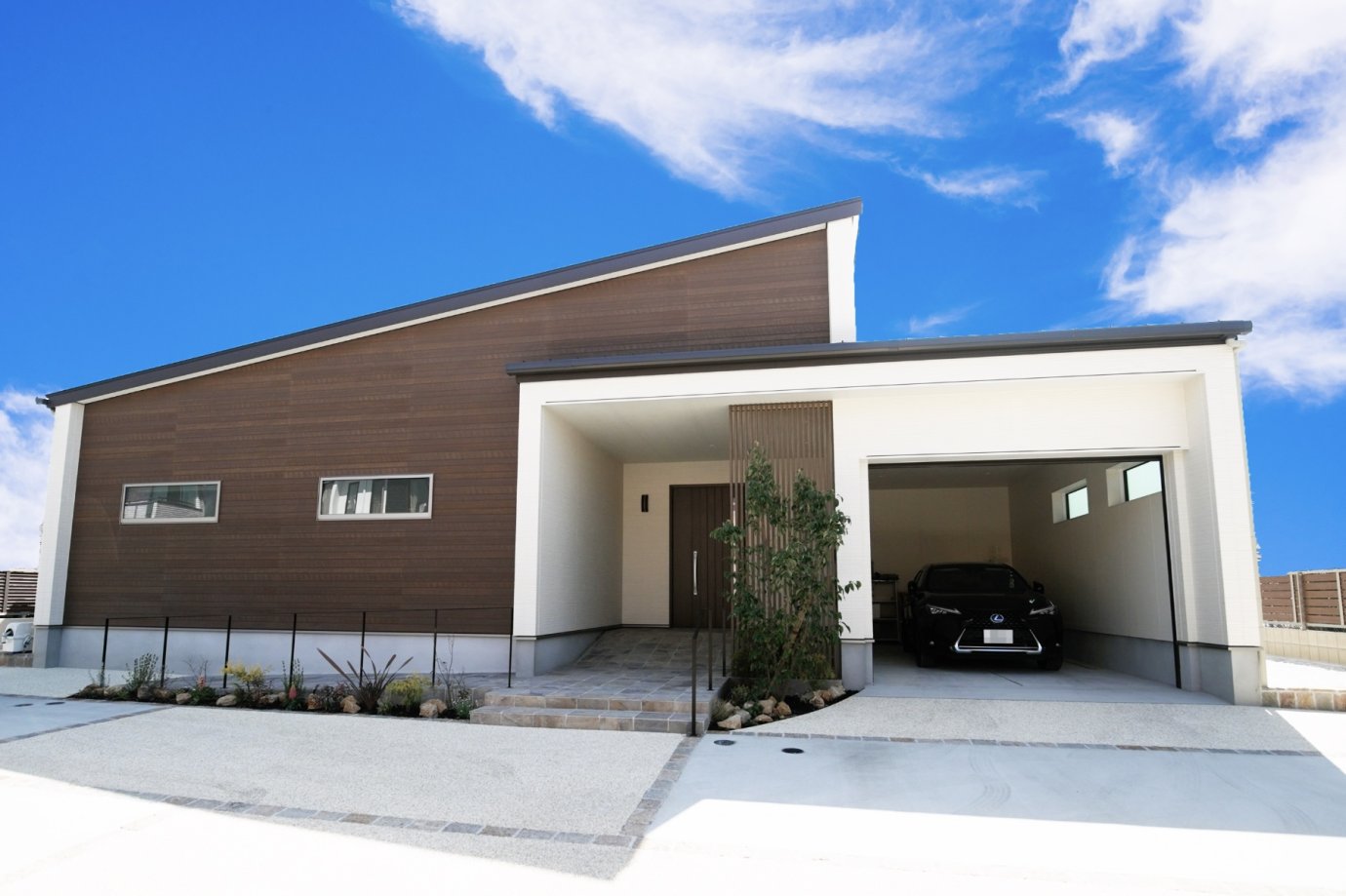 完成したのはインナーガレージと玄関アプローチが印象的な平屋です。オーナーご夫妻は不動産会社からの紹介で悠悠ホームと出会いました。「土地が気に入ってここにしようと決めたんですが、住宅会社をどこにしようかと思っていたところ、悠悠ホームを紹介してもらったんです」とご主人様。