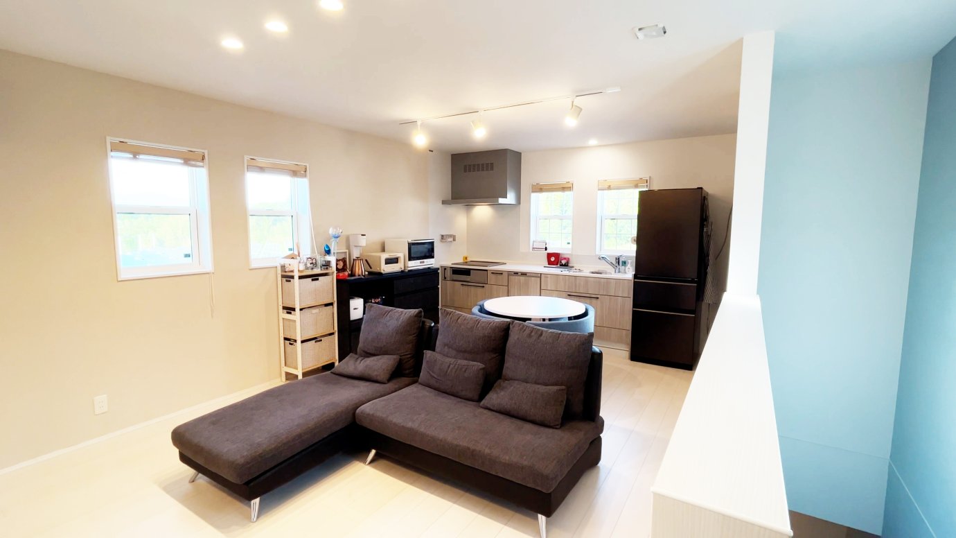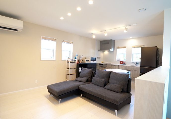 オーナー様邸は2階リビングです。お隣にもおうちがある関係で「日当たりが心配だったんですけど、窓から差し込む光も充分で、想像以上に明るい室内になりました」とご主人。以前は対面式のキッチンでしたが、今回は広さ確保のために壁付けキッチンにしたのも大正解!良いところは踏襲しつつ、私たちのスタイルにはこっちの方が合うかもな〜と自由に間取りを決められるのは注文住宅の本当に良いところだと思っています。窓もたくさん設けられていて、視線が抜けるので、狭さは一切感じないのもGOODです。