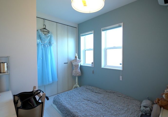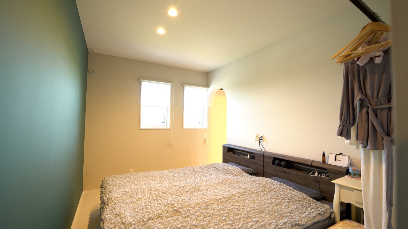 オーナー様邸の各部屋には、(ご主人の書斎を除いて)まろやかな色合いのアクセントクロスがしつらえられています。1階の子ども部屋、階段から2階リビングへ続く壁、そして寝室。それぞれに主張しすぎず、それでいてセンスを感じさせるカラーがお部屋とともに日々の暮らしも彩っています。
