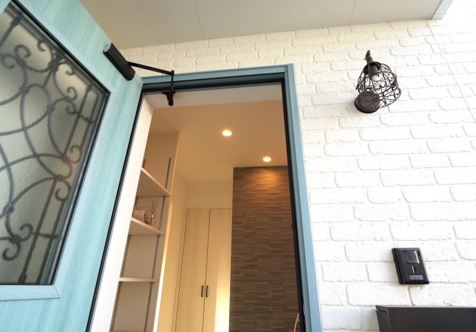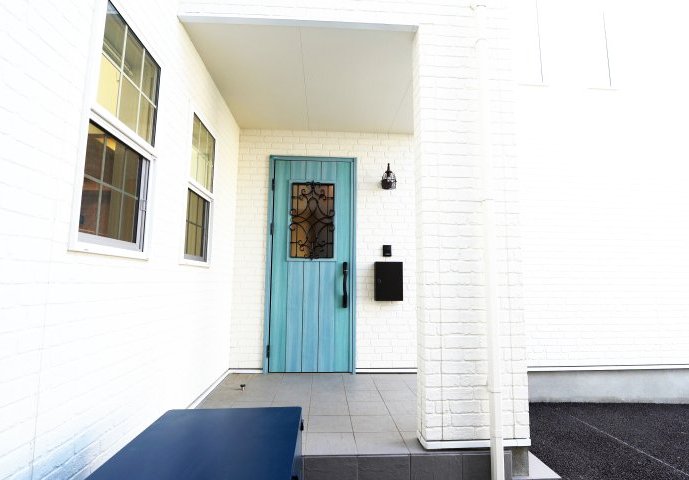 「こんな風にしたいなあっていう思いが実現したんです!」とニッコリの奥様。レンガ調のサイディングが眩しいほどの白の外観に、メールボックスやドアノブ、玄関ライトに使っているアイアンがアクセントとなったターコイズブルーの玄関ドアがとても印象的で、清潔感あふれる佇まいとなっています。