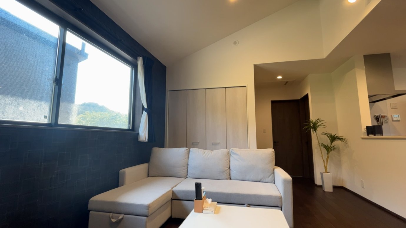 1階がガレージスペースなので、当然LDKは2階になります。階段を上がって行くと無垢の床材と勾配天井のリビングへ。大きめの窓から光が差し込み、とっても明るい空間となっています。一部に収納があるのですが「この収納の壁には筋交いを入れてないので、将来的に子どもが巣立ってふたりで暮らすようになった時に、隣の部屋とつなげてさらに広く使おうと考えているんです」と数十年先を見越した計画を話してくれました。