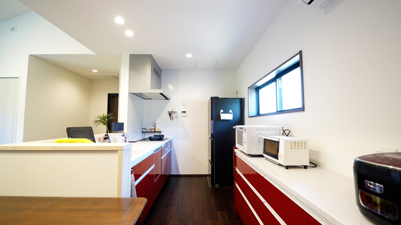 ひときわ目を引く、真っ赤なキッチン。これは奥様の好きな赤を採用しています。「シックな中に楽しさも必要かなって思って、バイクと同じカラーにしました」と奥様。収納も多く、ワークトップも広くて機能性もばっちりで料理が楽しくなりますと笑顔で話してくれました。