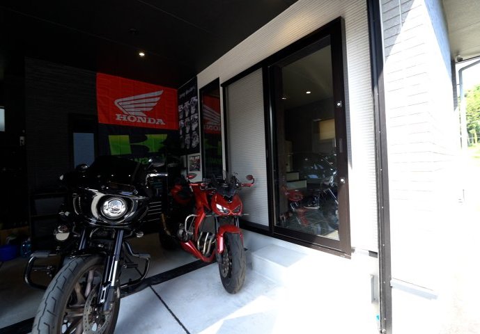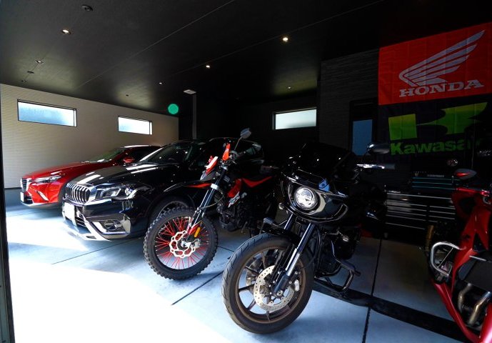 車2台とバイク3台が“住む”、そのスペースは、まさにショールームと言っていいほどのスケール感!防犯用のオートシャッターも完備。以前整備士をしていたご主人は、ここでタイヤの交換をしたりと、メンテナンスに余念がありません。ライティングもしっかりと考えられていて、夜の雰囲気もステキなんですよ。