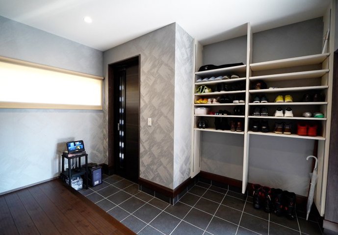 愛車を眺める楽しさと機能性が備わった広々玄関ホール