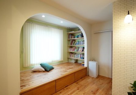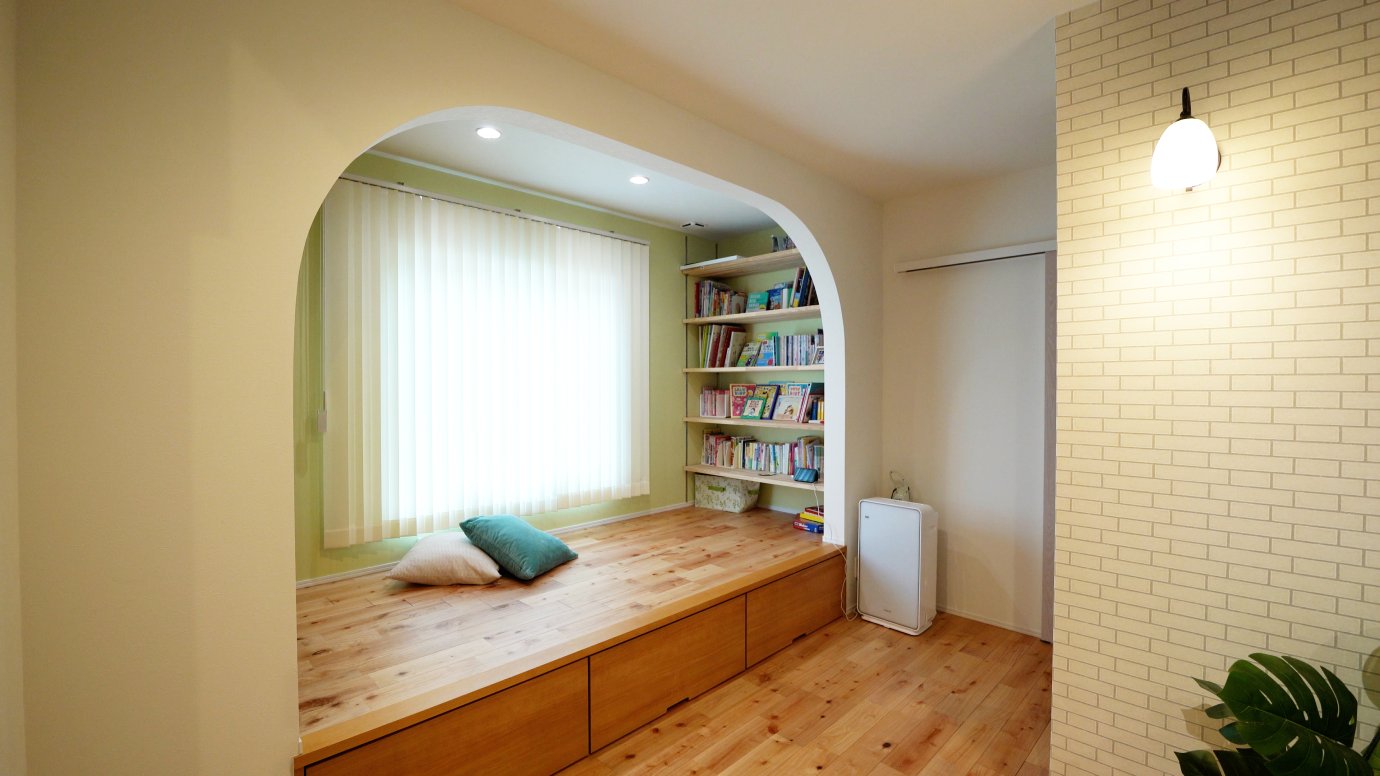 リビングの奥にはヌックがあります。小上がりになっていて収納力もあり、さらには本棚やカウンターも設置され、家族が思い思いに過ごせます。ちょっとしたミニライブラリーですね。日当たりもいいので、ちょっとウトウトするのにも最高の環境です。