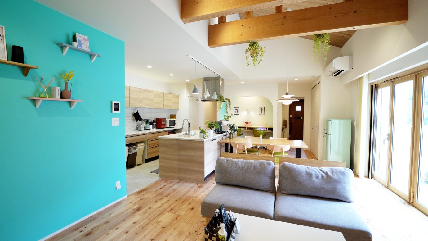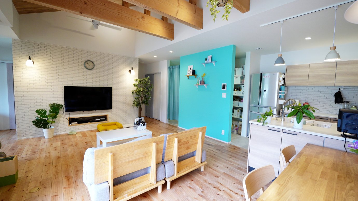 オーナー様邸の建坪は40坪以上。当然LDKも広々としていますが、その空間でひと際、目を惹くのは“ティファニーブルー”のアクセントクロス。「これはどうしても欲しかったんです!」と奥様の目が輝きます。確かにこの色のインパクトは、このブランドに興味がなくてもウキウキしてしまう魅力があります。実はこのクロスはおうちのさまざまなポイントに使われているんです。このあとも登場しますよ。