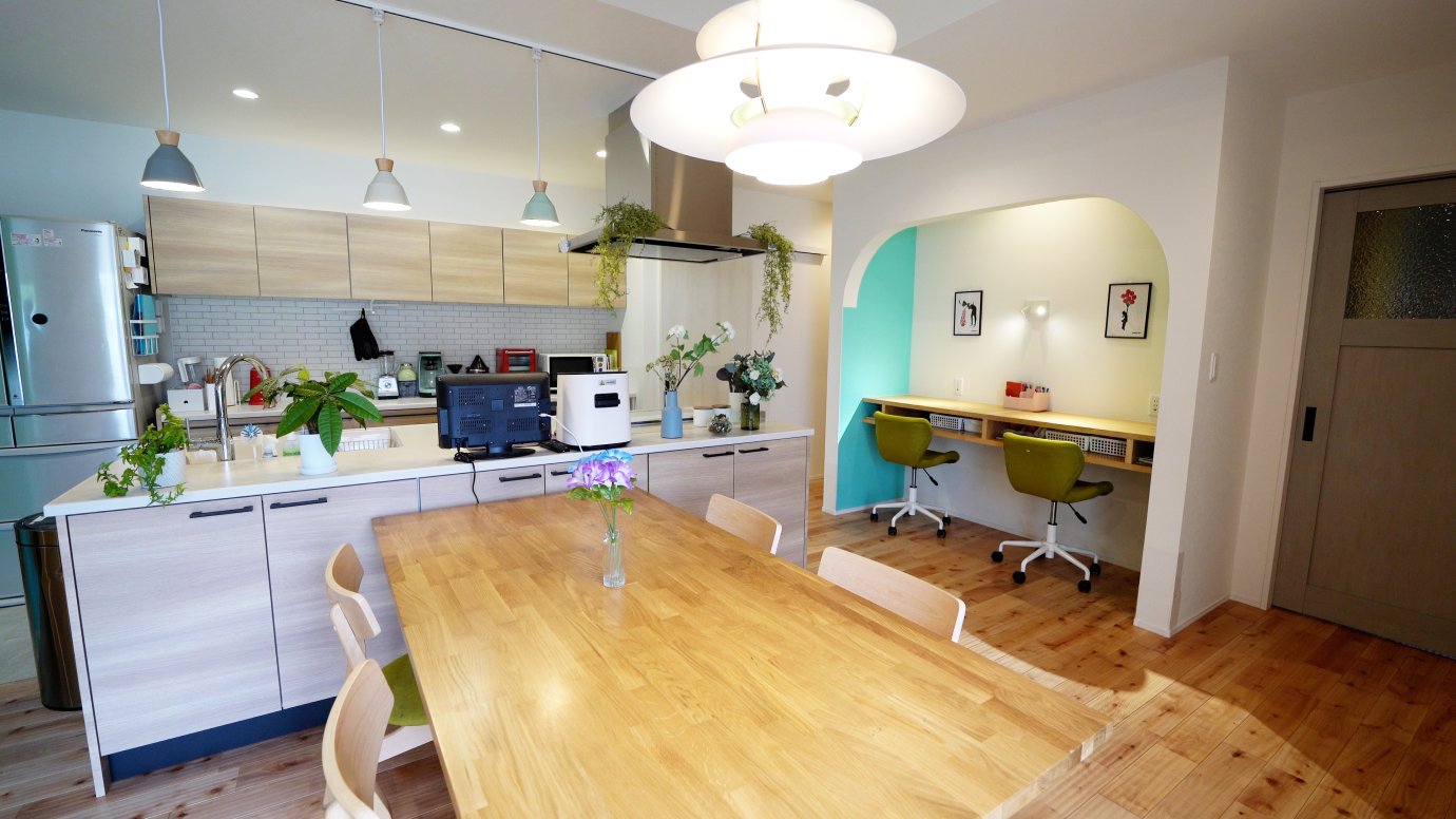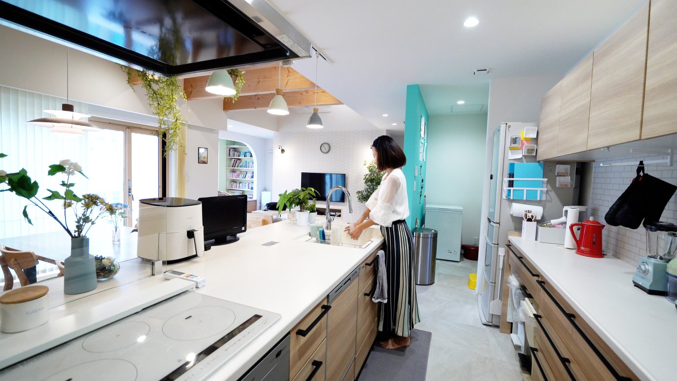 LDKの主役はやっぱりキッチン。オーナー様邸はアイランドキッチンを採用しています。「動きやすくて機能的なのと片付けがしやすいのが嬉しいですね!」とニッコリの奥様です。キッチン横にはパントリー。ここにもティファニーブルーがあしらわれています。