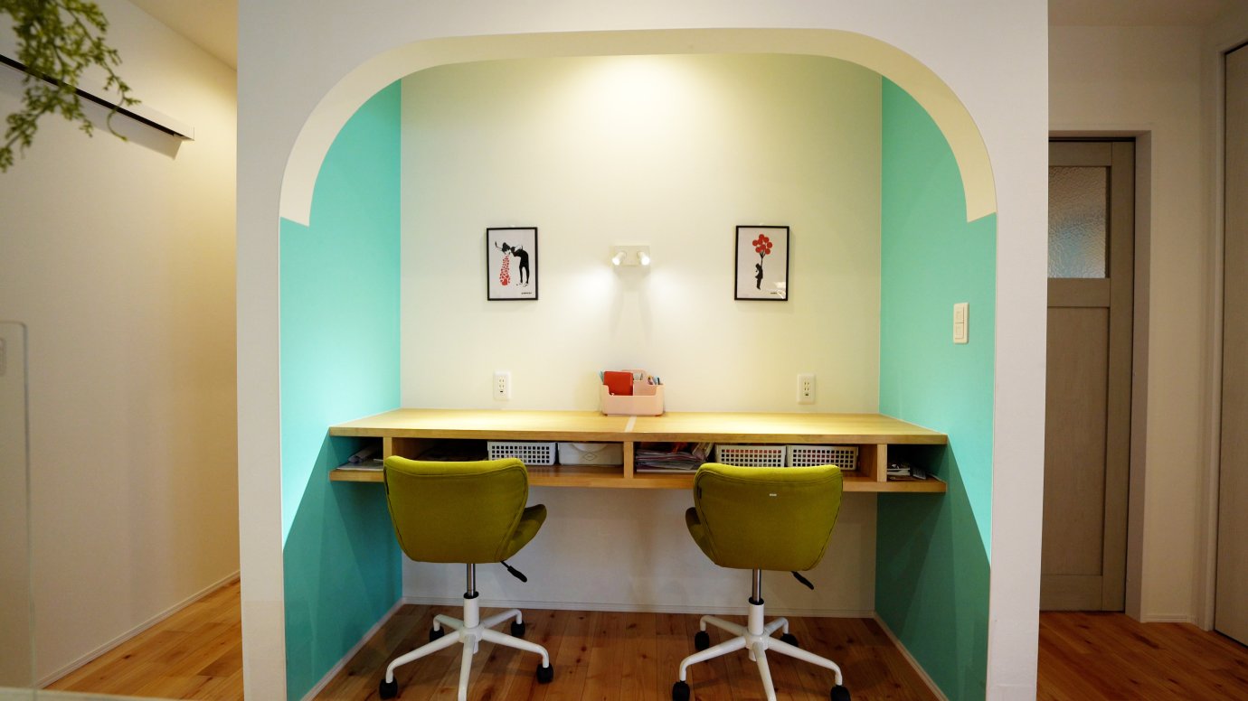 リビングに入るとすぐにあるのがこのコーナー。ヌックと同じくアールの仕様が優しさを感じさせます。姉妹二人が一緒に宿題や読書が出来るこのスペースにもあのティファニーブルーが!ホントに気分が上がる色です。