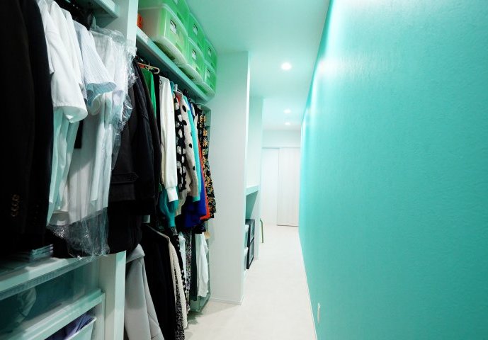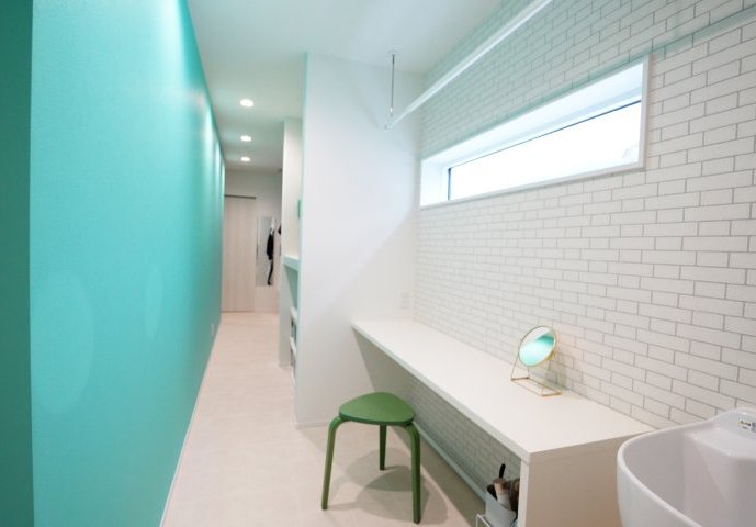 キッチンの奥から入る水回り。すると、なんとリビングを上質に彩っているあのティファニーブルーの壁紙が6~7メートルも続いています。これは圧巻!隠されているだけに逆にインパクト抜群です。洗濯~アイロンかけ~部屋干しがここで完結できる機能性も併せ持ち、家事ラクを実現した“楽しめる”スペースとなっています。さらにその奥には平屋では珍しい、2つ目のトイレがあるんです。ティファニーブルーはこのトイレにも採用されてました。