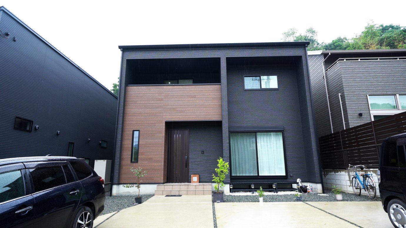 幹線道路からやや上がったところにある藤岡様邸は、裏も山手で緑に囲まれています。そのような環境の中、スクエアのフォルムを基調として、全体的には濃い目のチャコールグレー、玄関周りには木目のサイディングを使い、シャープでアーバンな大人志向の外観となっています。